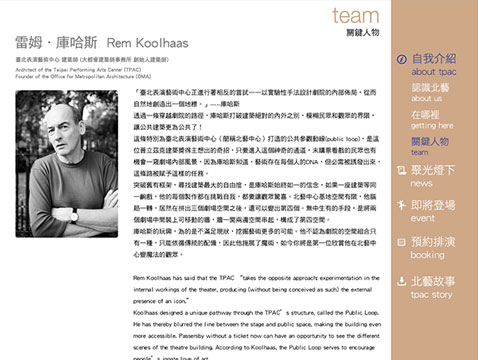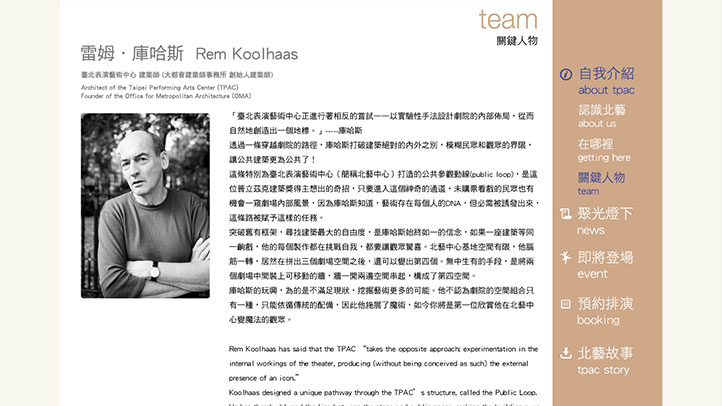 TPAC Taipei Performing Arts Center hopes that this website can have some design highlights in a generous and elegant design, so that visiting users can feel the vitality and momentum of performing arts.