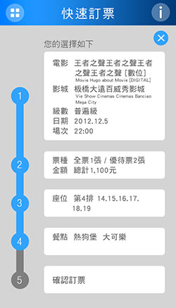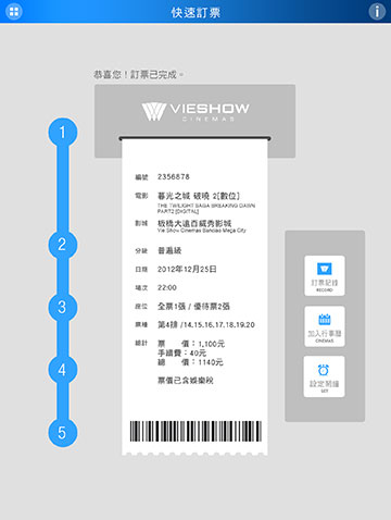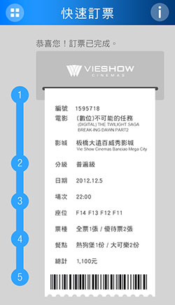 看電影是開心的事情,所以設計團隊也盡可能在UI設計上,增添使用者操作時的樂趣,例如在完成訂票時,會看到票券像是在實體櫃檯購票般,被列印完成吐了出來....讓人會心一笑。